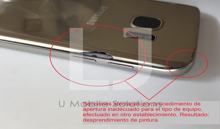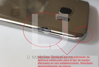 Cliente acude a nuestras instalaciones muy enojado, trayendo consigo un equipo Samsung S7 modelo SM-G930; el cliente nos entrega el equipo y enseguida notamos que la tapa trasera tiene daños muy visibles y desprendimiento.Preguntándole al cliente éste nos informa que acudió a un "servicio de reparación" por un cambio de bocina que “le salía barato”, donde al momento de la entrega el cliente se percató del daño en la tapa y al reclamar por el servicio pésimo no se hicieron responsables del daño inducido argumentando que “el equipo es muy delicado y podía pasar eso”.
